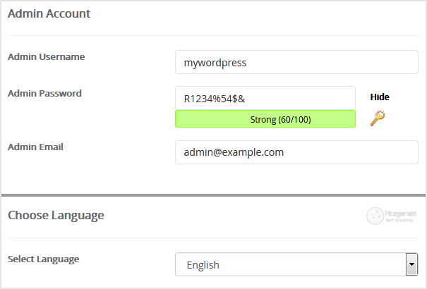 • Admin Username: Your new WordPress username (for security reason do not use the Administrator or the Admin username.
